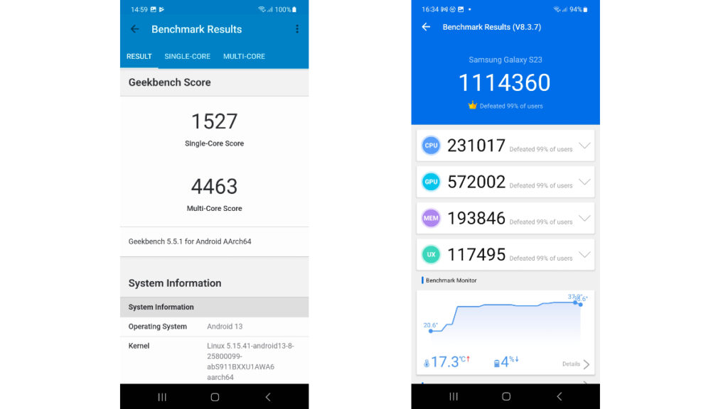 The Galaxy S23 gets a 3,900mAh battery, a 200mAh increase from its predecessor. While this may sound like a minor upgrade, it has improved the S23’s battery life substantially. Despite this improvement, the Galaxy S23 still has a one-day battery life (which can fluctuate if you’re on an active 5G network throughout the day) and can’t last two days straight. However, it can endure extended periods of heavy usage compared to the S22 and still maintain its battery life. I managed to get over 5 hours of active usage before having to reach for the charger.