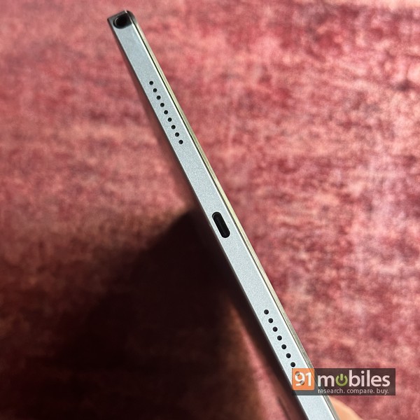When held in portrait mode, the top left of the tablet is where you’ll find the volume rocker and power key, with the SIM tray placed towards the right. The right spine holds the USB Type-C port and a 3.5mm audio port tucked away at the corner. Both sides of the tablet have holes at four places, giving the impression of a quad-speaker setup, but only two (one on each side) actually churn out audio. The sound is decently loud, not too rich.
