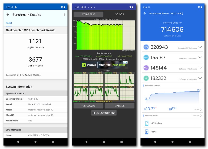 The Motorola Edge 40 comes with the MediaTek Dimensity 8020 SoC, which is a shade lower in performance metrics than the 8100, released last year. At times the handset’s thin design restricts its thermal envelope leading to some throttling. The phone does bang in good scores on benchmarking platforms with Antutu showing a result of 714,606 and Geekbench 6’s multi-core test outputting 3,677. Despite this, the Edge 40 has a tendency to heat up a bit during strenuous tasks. All this to say your regular smartphone usage remains unaffected but something like playing BGMI for long periods of time at Extreme 60fps settings will burn through the battery rapidly while also introducing a bit of lag. The phone comes in a single 8GB LPDDR4X RAM and 256GB UFS 3.1 storage variant.