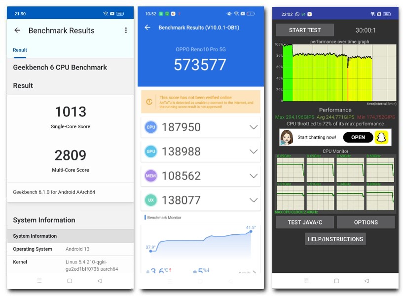 - When it comes to benchmarking tests, the OPPO Reno10 Pro performs decently, scoring 5,73,577 points on AnTuTu. On Geekbench 6, the handset achieves 1,013 and 2,809 points in single-core and multi-core tests, respectively. That said, the phone’s performance throttles at 72 percent of its peak performance while running 50 threads for half an hour on the CPU Throttle test. The OPPO Reno10 Pro 5G comes in just one RAM and storage configuration: 12GB+256GB. While the RAM can be expanded virtually up to 12GB, the storage remains fixed as there is no microSD card slot.
