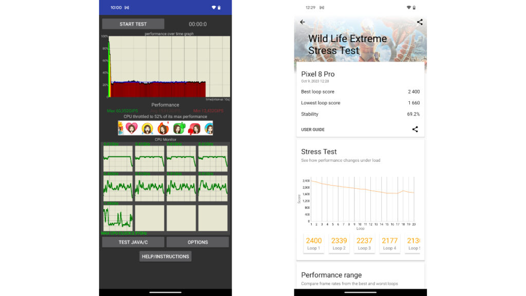 The Tensor G3 chipset also seems to throttles the performance of the device too, more so than the Tensor G2 last year. After a 20-minute CoD: Mobile gaming session, the CPU Throttle test showed a performance throttling of around 52 per cent. However, I didn’t see any severe lag or frame rate issues during gameplay. In our 3DMark Extreme Stress Test, the device delivered around 70 per cent stability, similar to what the Snapdragon 8 Gen 2-powered iQOO 11 managed. That said, the Tensor G3 chipset paired with 12GB of RAM is capable of running day-to-day tasks without getting overwhelmed. You only get the 128GB storage option in India, which is disappointing considering the price tag.