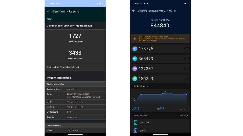 A brand new Tensor G3 chipset powers the Pixel 8 and Pixel 8 Pro. If you were thinking Google’s latest processor is a significant improvement over the Tensor G2 and can finally take on Qualcomm’s Snapdragon 8 Gen 2 SoC, you’d be mistaken. The Pixel 8 Pro’s benchmark scores are quite average. The device scored 1727 in single-core and 3433 in multi-core on Geekbench and around 845,000 on AnTuTu. In comparison, the Galaxy Z Fold5 with the Snapdragon 8 Gen 2 processor scored 1968 and 5137, respectively, on Geekbench and 1,492,136 on AnTuTu. Even last year’s iPhone 14 Plus with the A15 Bionic chipset scored higher, scoring 4689 in multi-core on Geekbench and 854,000 on AnTuTu.