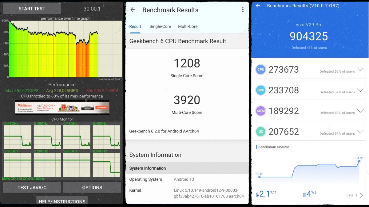 In real-life usage, I got up to seven hours of backup with the highest settings enabled (AoD, 120Hz refresh rate, mild gaming, and high brightness) on the Vivo V29 Pro. Naturally, you can expect a relatively better backup per charge with moderate settings.
