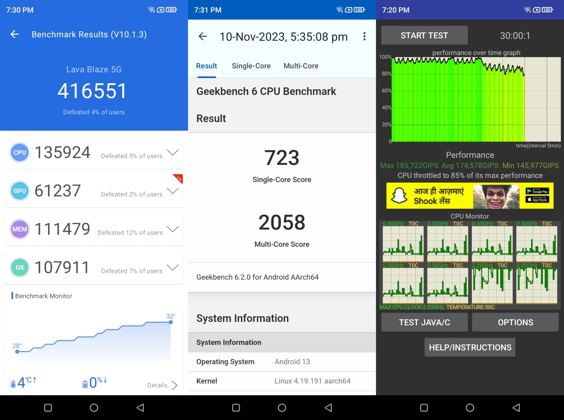 The Lava Blaze 2 5G performance is on par with other smartphones within the segment such as the POCO M6 Pro. The handset is powered by an octa-core MediaTek Dimensity 6020 chipset paired with up to 6GB RAM and 128GB user-expandable storage. Its synthetic benchmark scores don’t disappoint. The handset scored 4,16,551 points on AnTuTu, whereas its Geekbench scores stand at 723 and 2,058 in single-core and multi-core tests respectively.