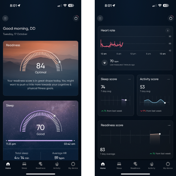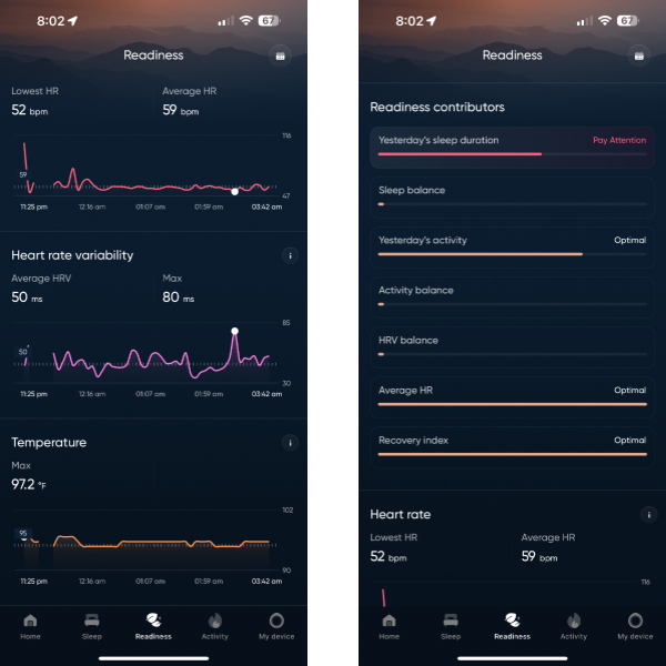 You can view more details under each of these parameters, and go back in time to view historical data and trends. Based on these figures, the app also calculates a readiness score which indicates how prepared or ready you are to go on about your day. In some sense this is similar to the body battery figures that Garmin shows with its smartwatches. Do note that this is only an indicative score which is calculated by algorithms that source data from the various inputs gathered by the Luna Ring.