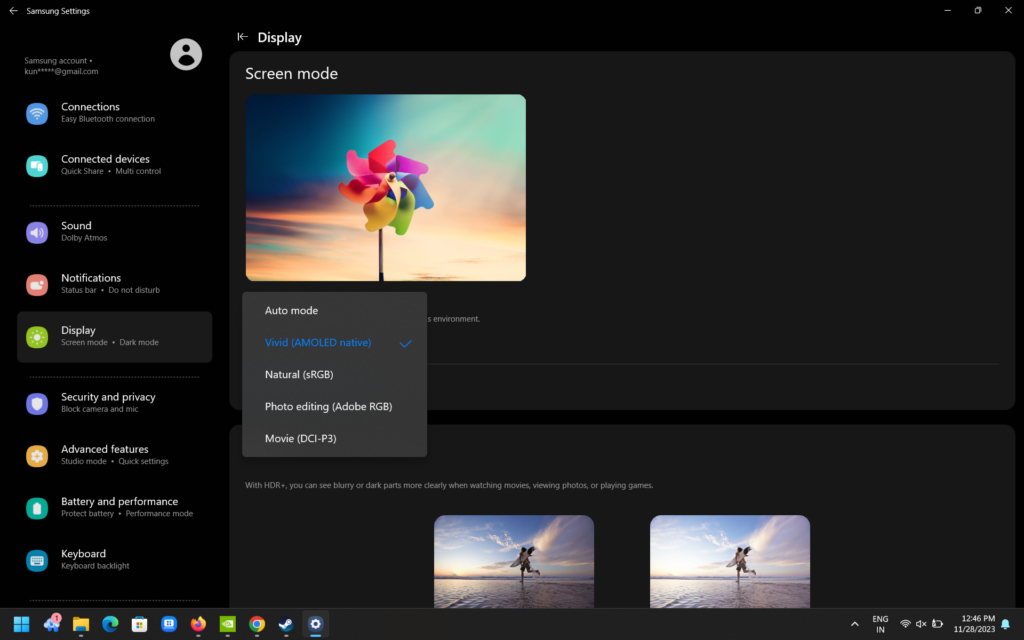 There are various colour profiles accessible directly from the default Windows Display settings. You can also access these colour profiles via the Samsung Settings app which also lets you enable HDR+, Focus Mode to darken the area where an app is not being displayed and system-wide dark mode. In terms of brightness, the display is capable of close to 400 nits and 500 nits in HDR. In comparison, it isn’t as bright as the MacBook Pro, which goes over 1,000 nits, but it is plenty for most use cases.
