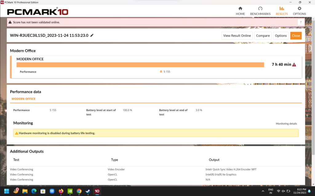 We usually test the battery using the Modern Office battery test scenario of PCMark 10. It scored 7 hours and 40 minutes (at 60Hz refresh rate and 150 nits brightness), which is considerably lower than the Galaxy Book3 Pro 360, but you need to remember that the Ultra comes with more power-hungry chips. As for day-to-day use cases, I got close to 9 hours of battery life while charging takes about an hour and a half. Overall, a far cry from what you can get on a 16-inch MacBook Pro.