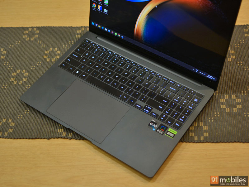 Similar to the one we saw on the Galaxy Book3 Pro 360, the keyboard is quite large with a dedicated number pad on the right. The keys are nicely spaced too and feel comfortable for long typing sessions. Since it is a membrane-type keyboard the keys are soft, but there is a good amount of feedback and key travel. You also get white backlighting with three brightness levels that can be toggled using the Fn and F9 keys. Additionally, there’s a fingerprint scanner built into the power button, which works flawlessly and lets you log into Windows swiftly.
