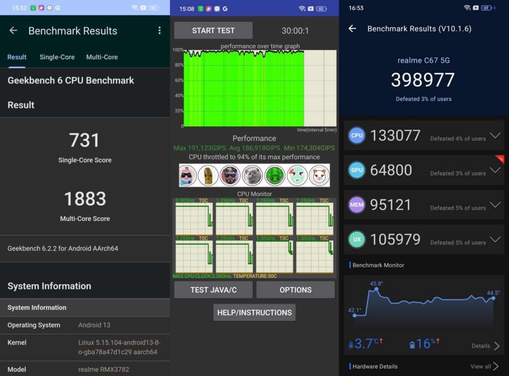 When it comes to the benchmarking tests, the Realme C67 5G manages to achieve fractionally better scores on AnTuTu and GPU compared to the POCO M6 5G (review), which is also driven by MediaTek Dimensity 6100+ SoC.