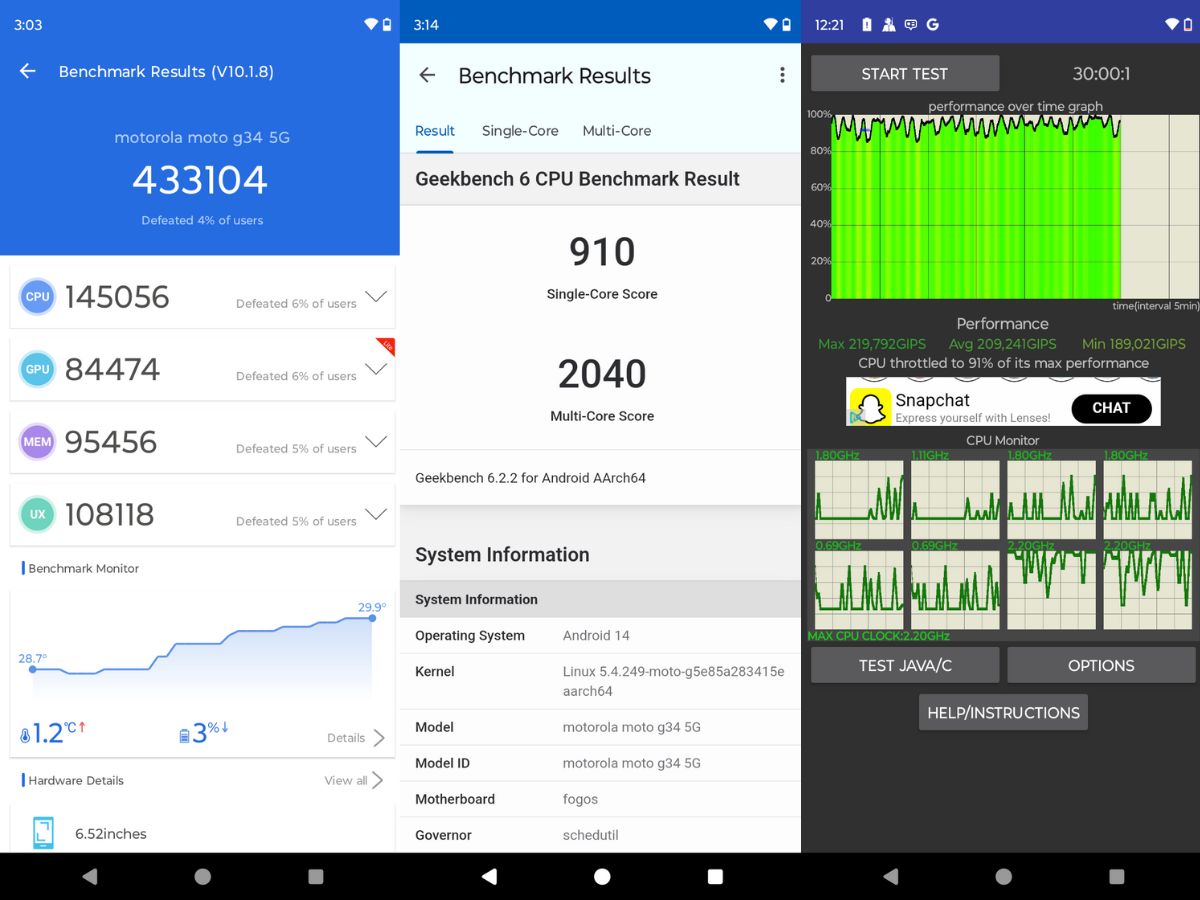 As far as the benchmarks are considered, the G34 managed to get a score of 433104 points on AnTuTu, while it got a multi-core test score of 2040 on Geekbench. In the CPU throttle test where the phone was running 50 threads for 30 minutes, it’s performance throttled to 91 percent of its max performance, which is pretty impressive.